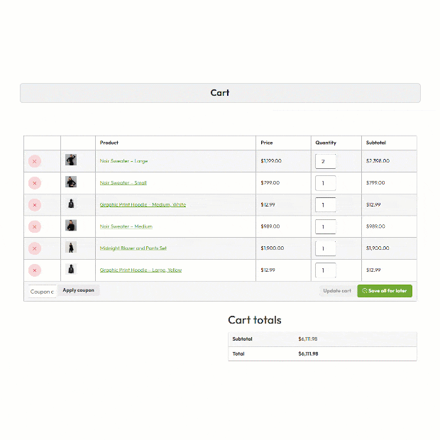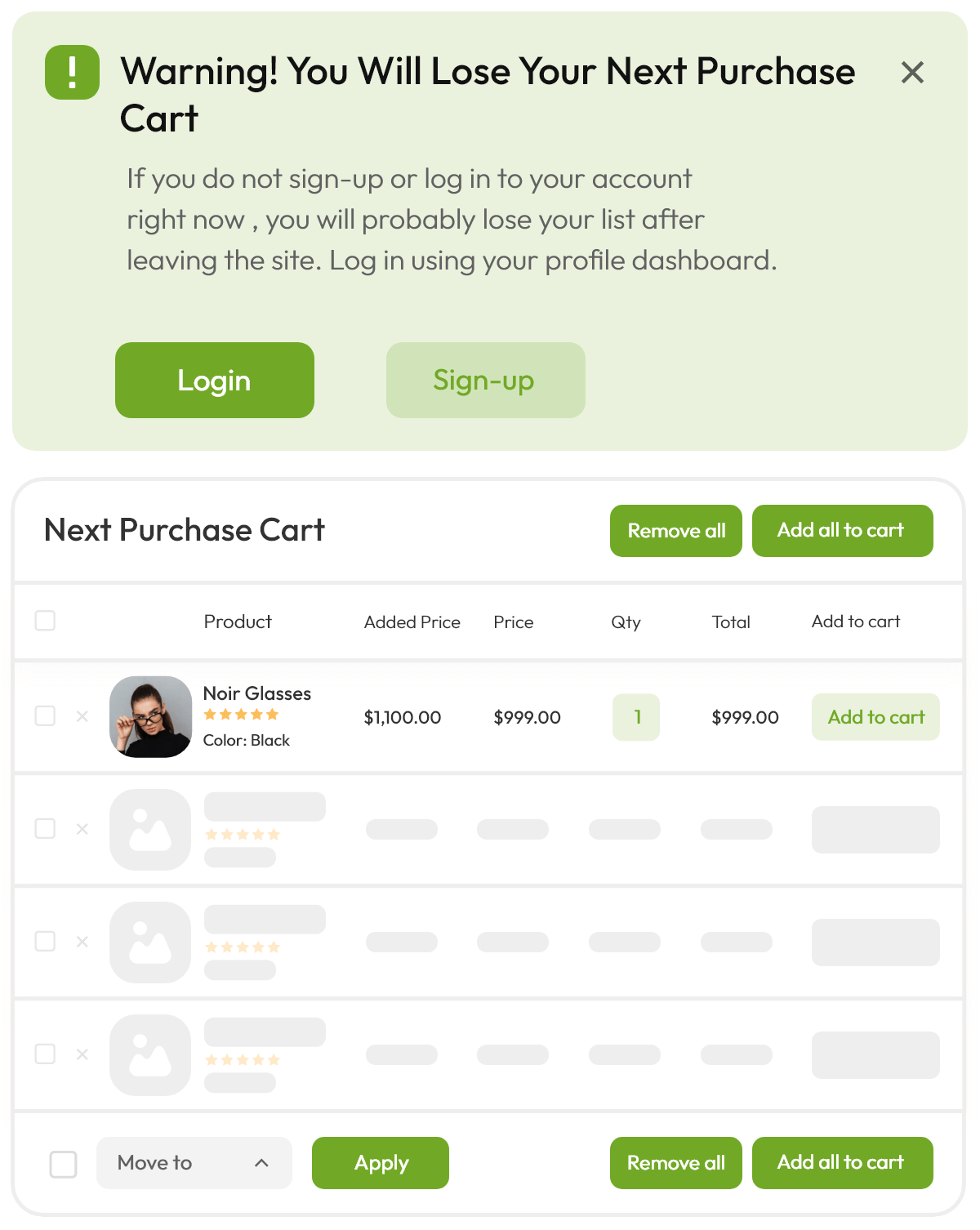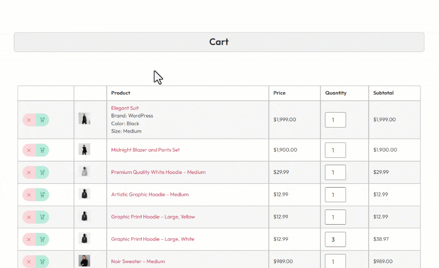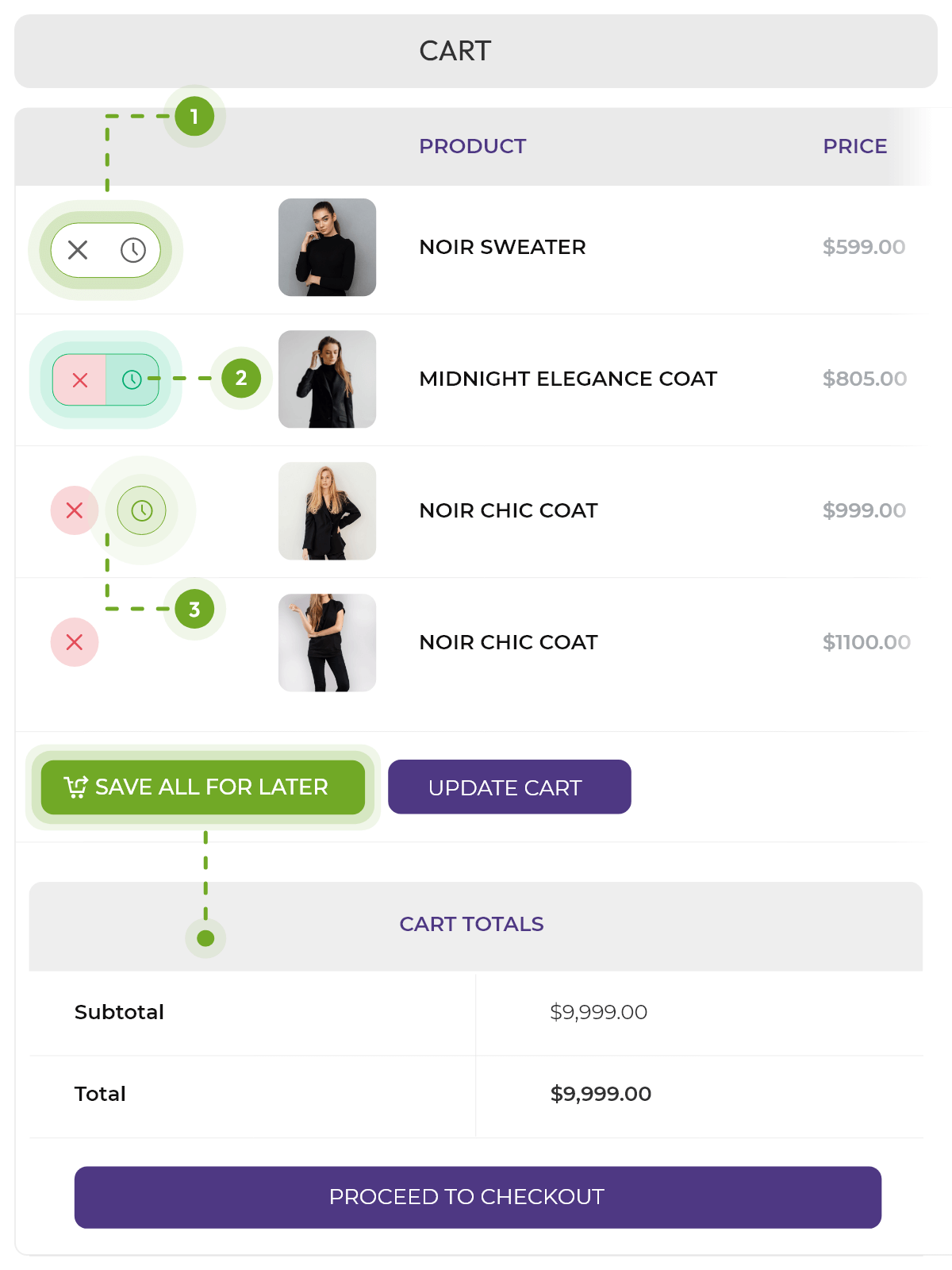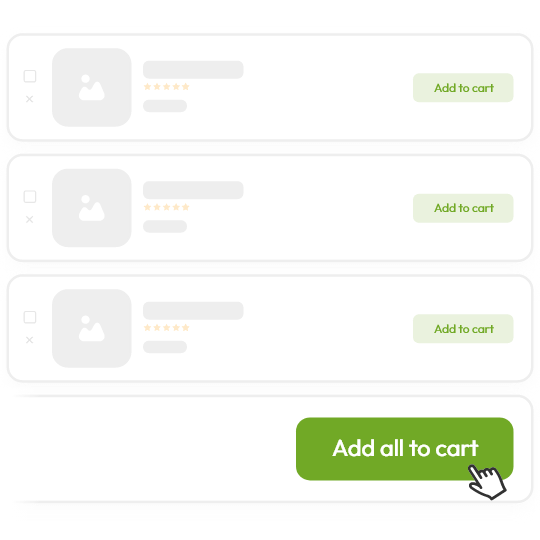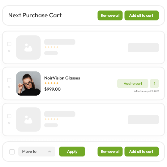 Move products to the cart with a click, and delete items individually or in bulk. Our tool seamlessly adapts to various product types and add-ons while allowing swift transitions between your cart and next purchase.