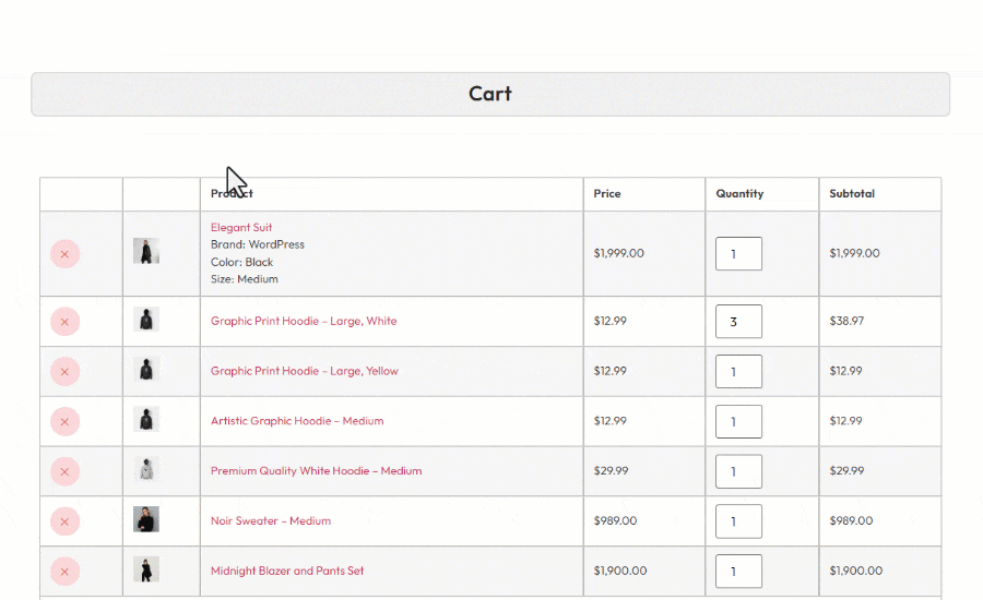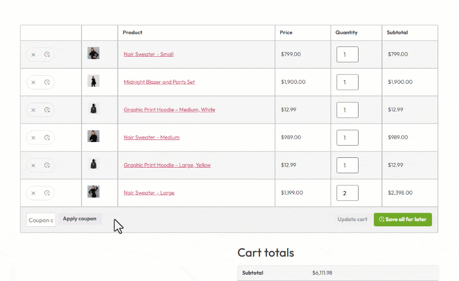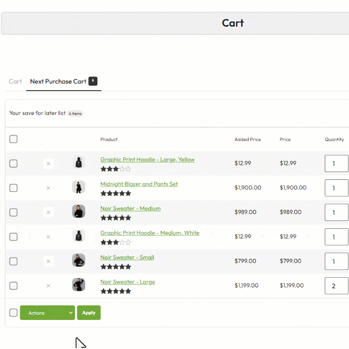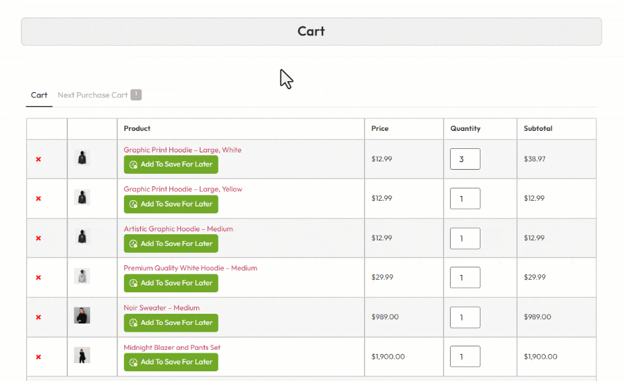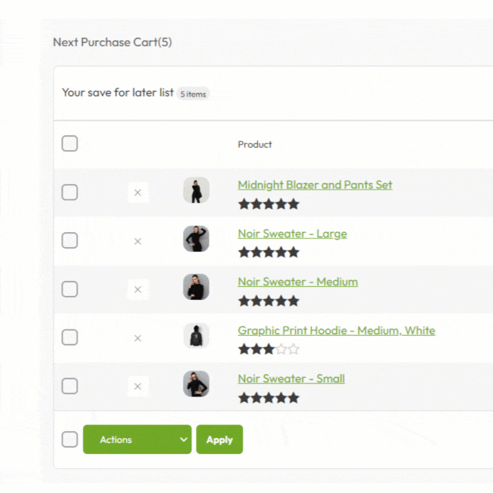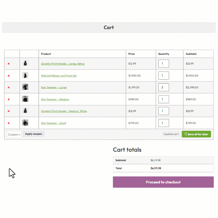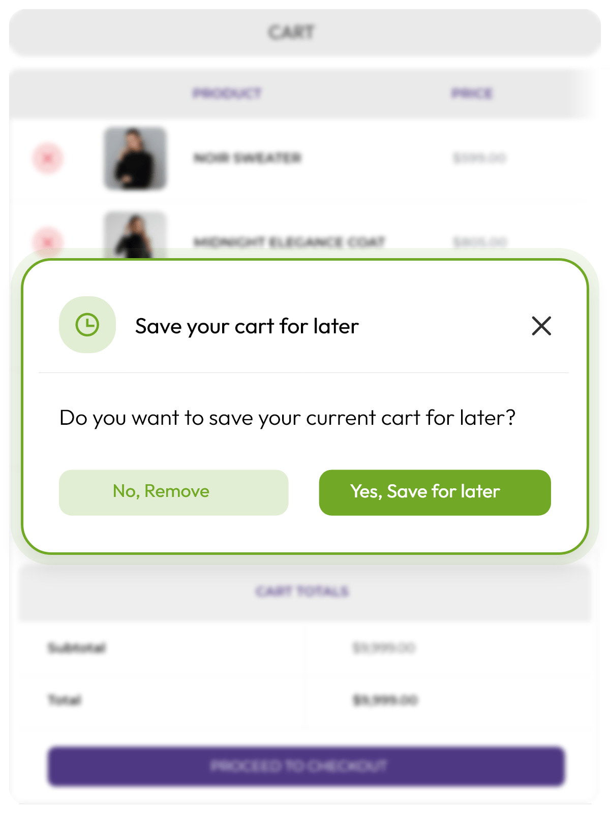 Move products to the cart with a click, and delete items individually or in bulk. Our tool seamlessly adapts to various product types and add-ons while allowing swift transitions between your cart and next purchase.
